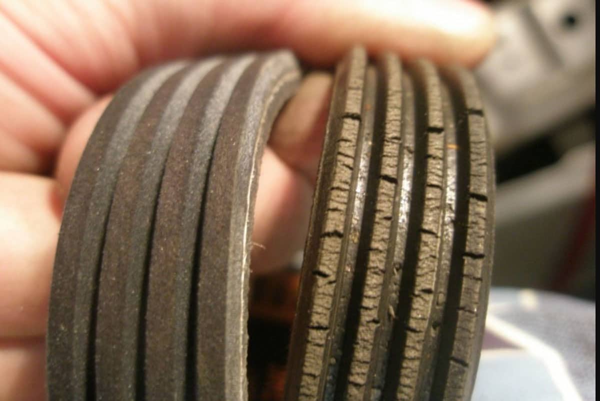 Трещины, отслоения резины, следы масла или антифриза на поверхности снижают сцепление со шкивами. Грязь работает как абразив и ускоряет износ.